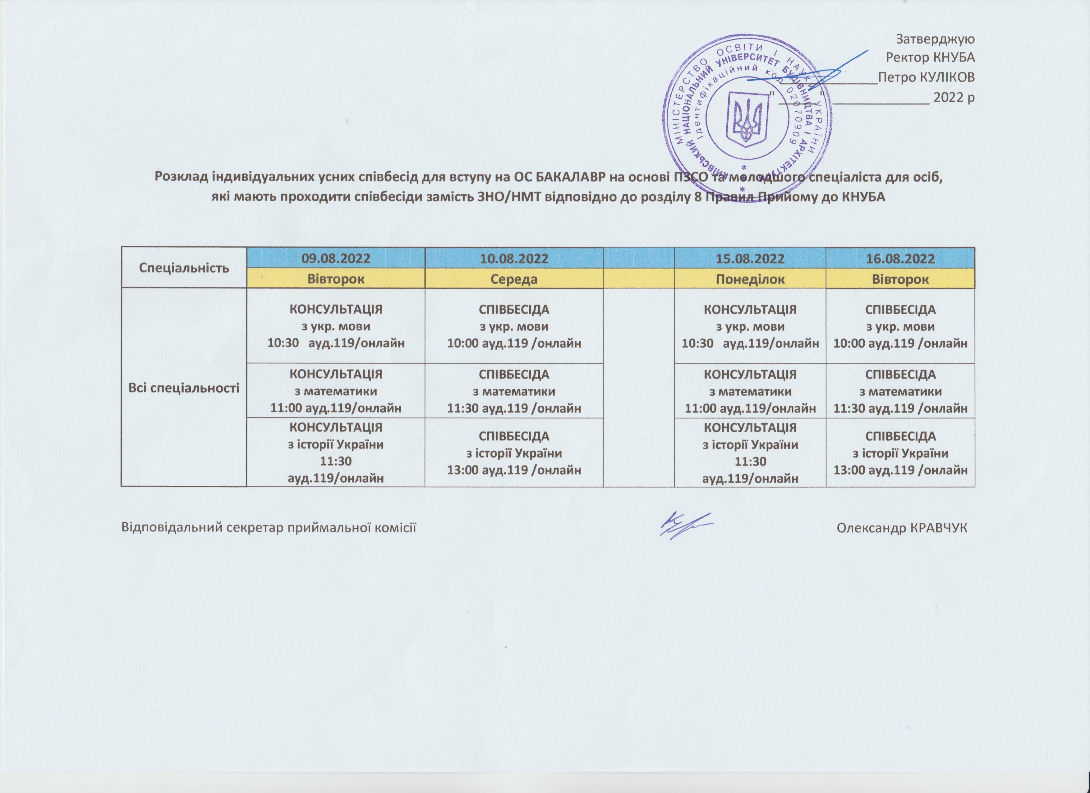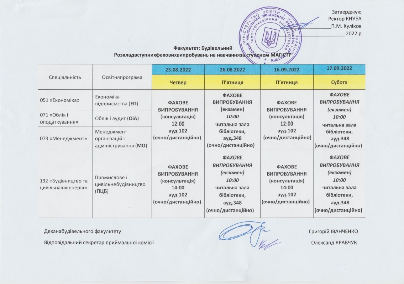 Розклад індивідуальних усних співбесід для вступників на ОС Магістр (тільки для вступників на спеціальності 051, 071, 073, 076, 081, 281, які користуються спеціальними умовами вступу відповідно до розділу 8 Правил прйиому до КНУБА): 1 сесія(30 серпня); 2 сесія (19 вересня)